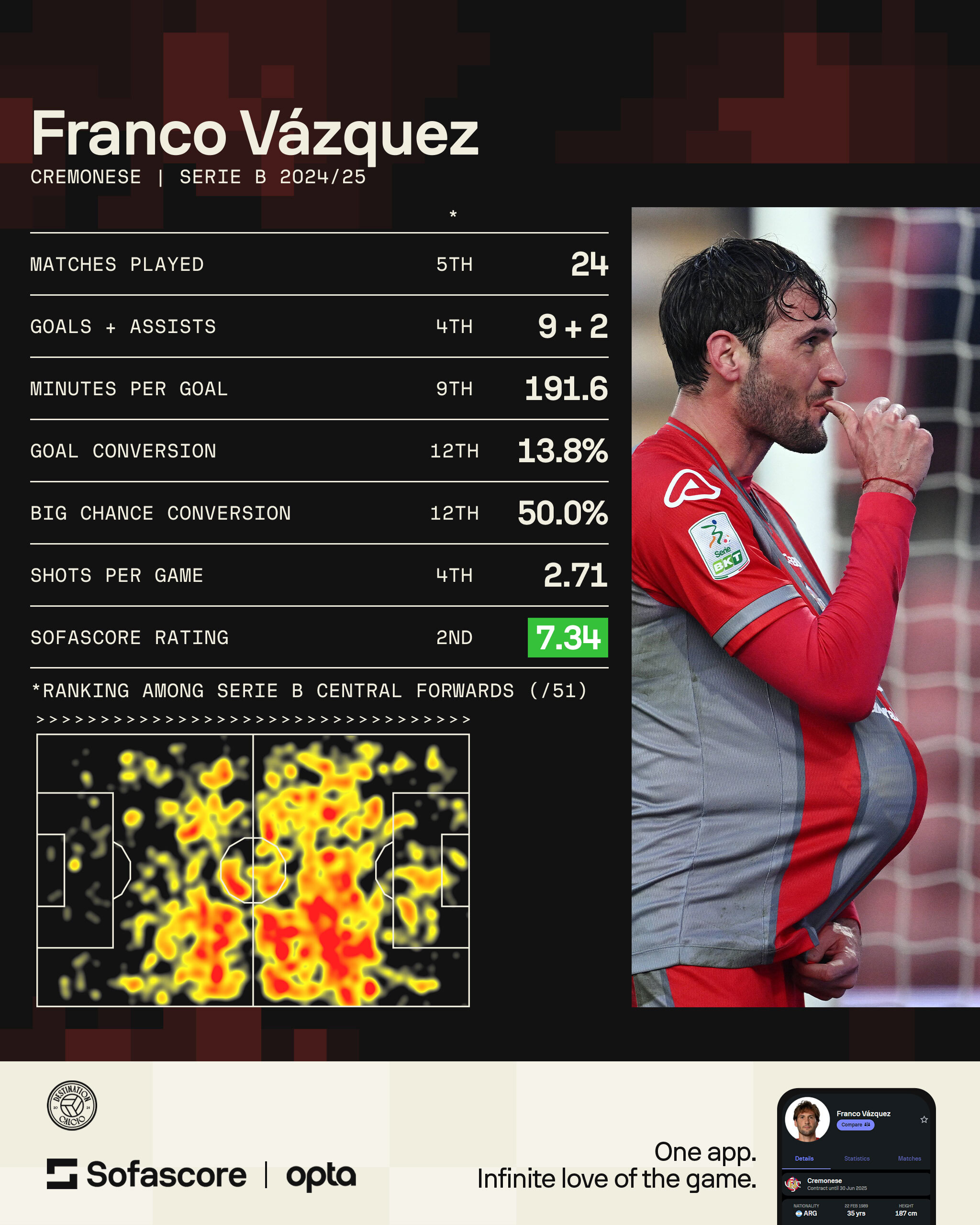 While Bari have struggled for goals, Cremonese have had no such problems and have the fourth-best attack in the division with Franco Vazquez rolling back the years at the age of 35 to score nine goals in 24 appearances and Manuel De Luca adding four of his own.