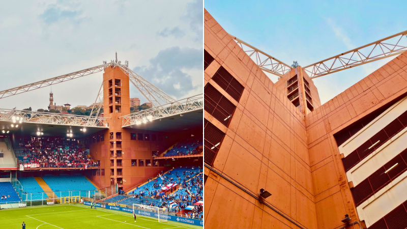 The most passionate supporters occupy the Gradinata (“steps”) at either end of the stadium: Sampdoria in the Sud and Genoa in the Nord. The stadium is one of the few historic venues in Italian football without an athletics track, hence no “curva” here. This enhances the intensity of the experience, as fans are close to the pitch, and the steep stands and looming hills beyond create a cauldron-like environment.