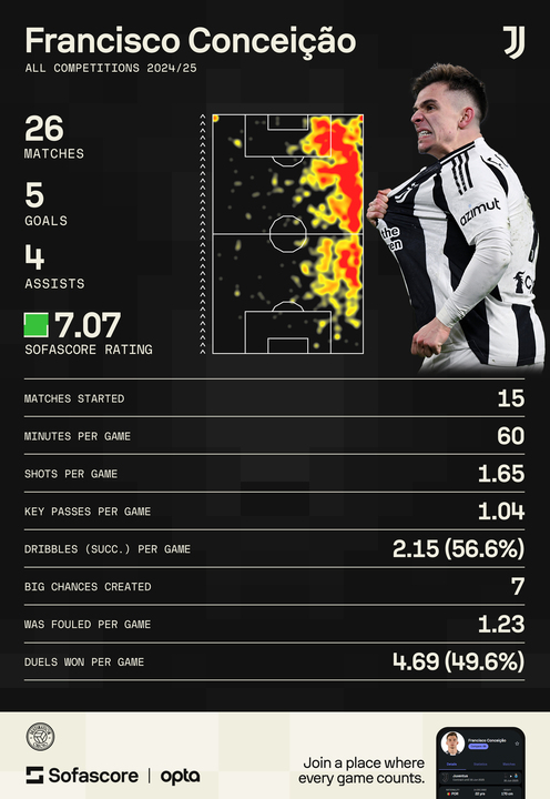 With Thiago Motta’s other attacking options on the wings, Nico Gonzalez, Kenan Yildiz and Samuel Mbangula, lacking the rapid pace of Conceicao, his presence gives Juve another method of killing its prey.