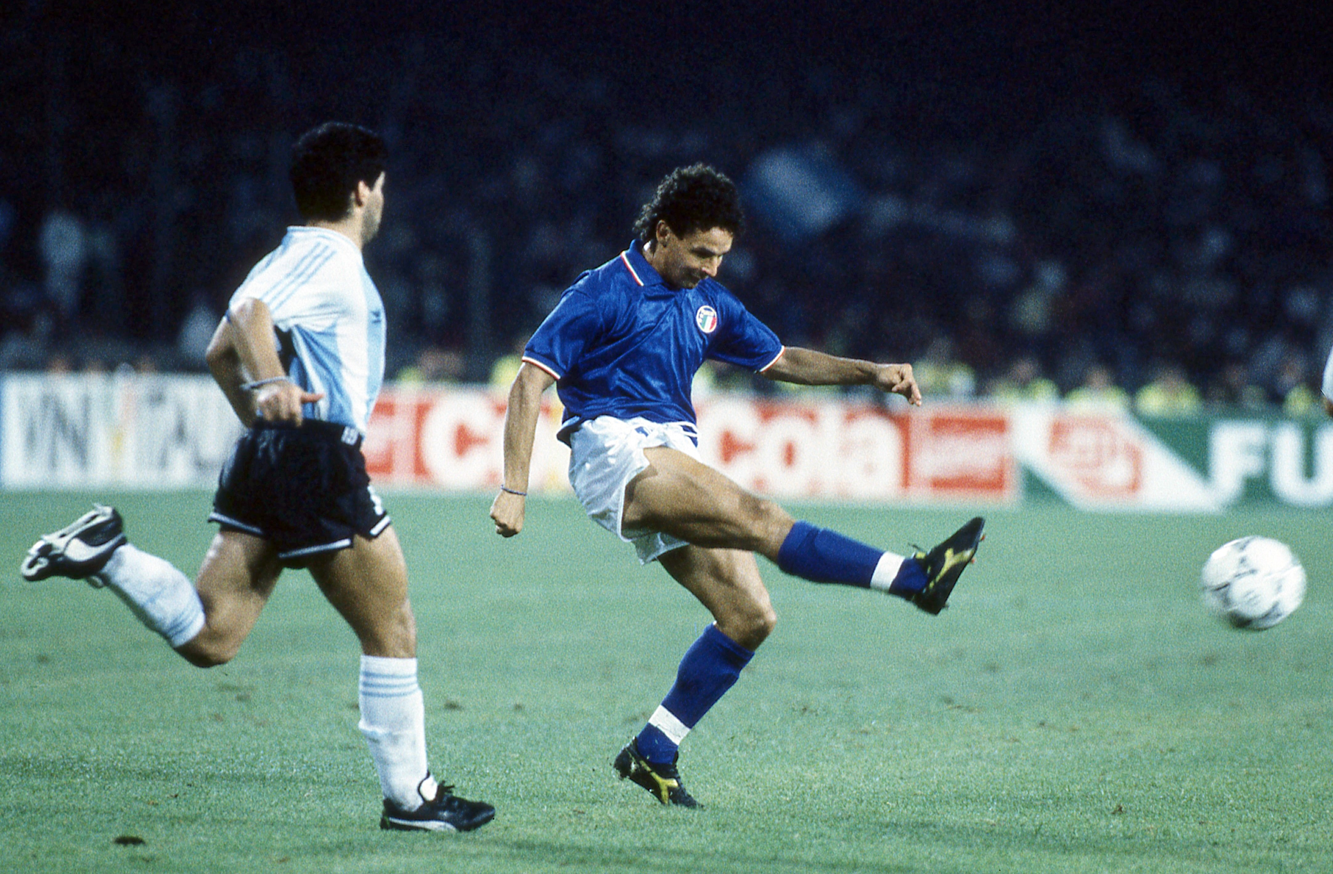 Yet the likes of Schillaci, Roberto Baggio, Giuseppe Giannini and Paolo Maldini looked the part in this offering from Diadora, which continued with the shiny effect from Mexico 86.
