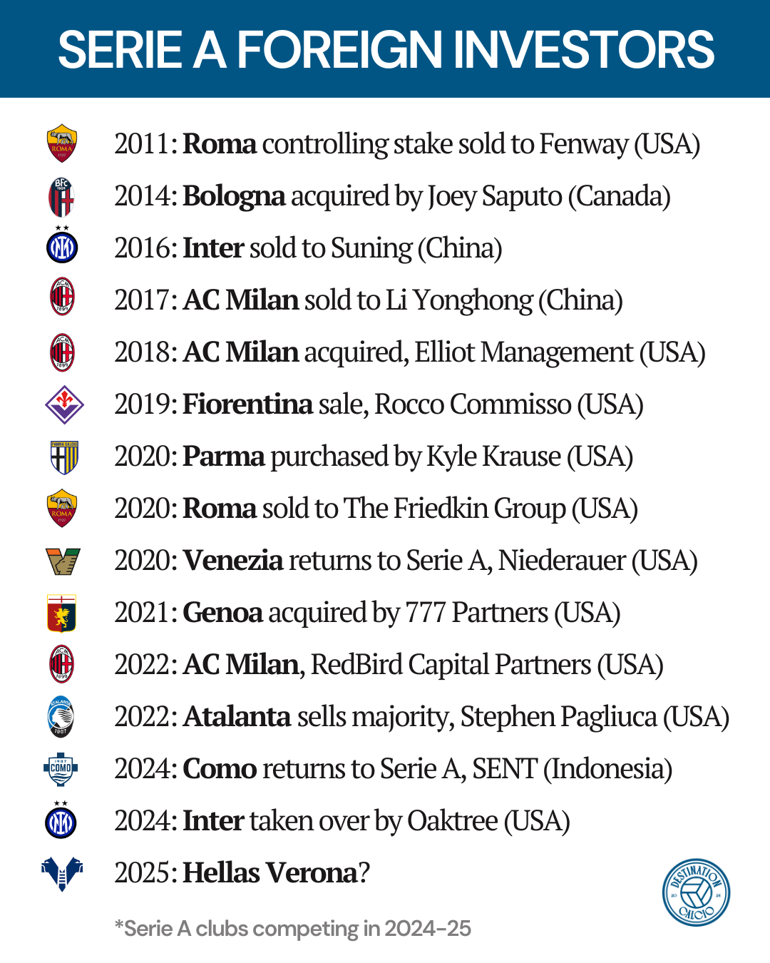 Since 2020, more and more Serie A fans have become desensitised to foreign ownership, whether it be Canadian (Bologna), Chinese (Milan and Inter), Indonesian (Como 1907), or American: Atalanta, Fiorentina, Genoa, Inter, Milan, Parma, Roma and Venezia.
