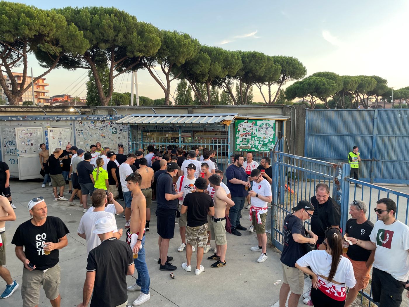 We were funnelled towards a holding area behind the stadium. As the buses wheezed to a halt, bloated bodies spilled out, dashing for the nearest wall. Picnic tables appeared from nowhere, laden with salumi and beer. The sun, the occasion, and Padova’s long-awaited return to Serie B had drawn not just the hardened tifosi in trasferta but families, students, and the curious.