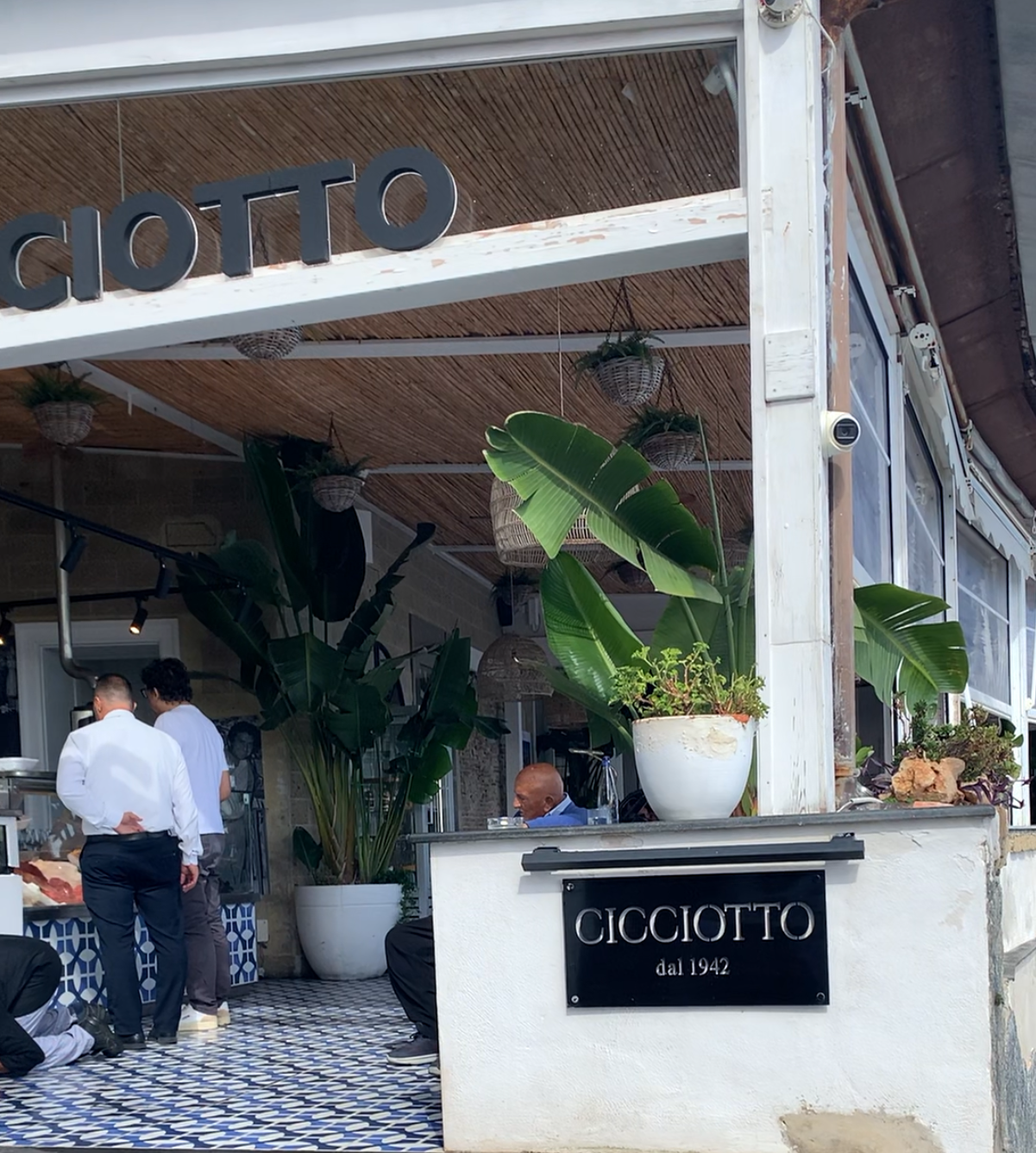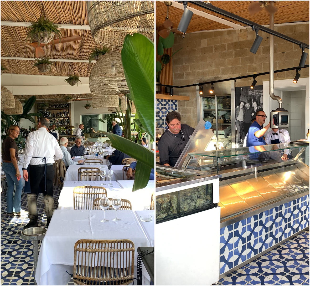 It’s the first sight you’re greeted with as you enter the restaurant. The black, blue and white tiles surrounding the display then give way to beach hut vibes as you move further into the restaurant. Bamboo canes cover the roof accompanied by wicker lampshades and banana trees populate the path through the white-cloth-covered tables to the inner sanctum, where most of the establishment’s more recognisable customers are afforded their privacy.