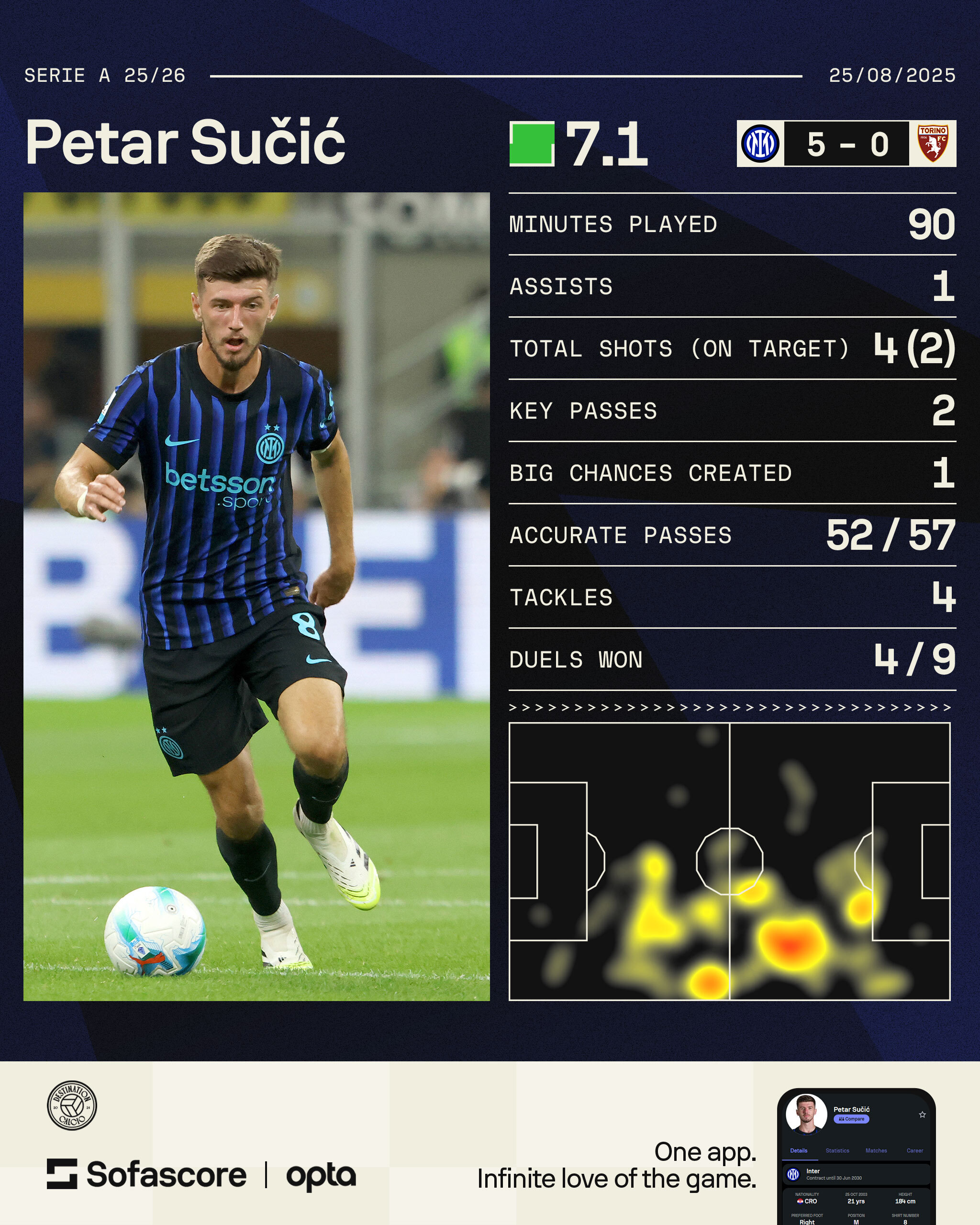 Sucic completed 52 of his 57 passes, set up one of Inter’s goals, completed four tackles and had two shots on goal.