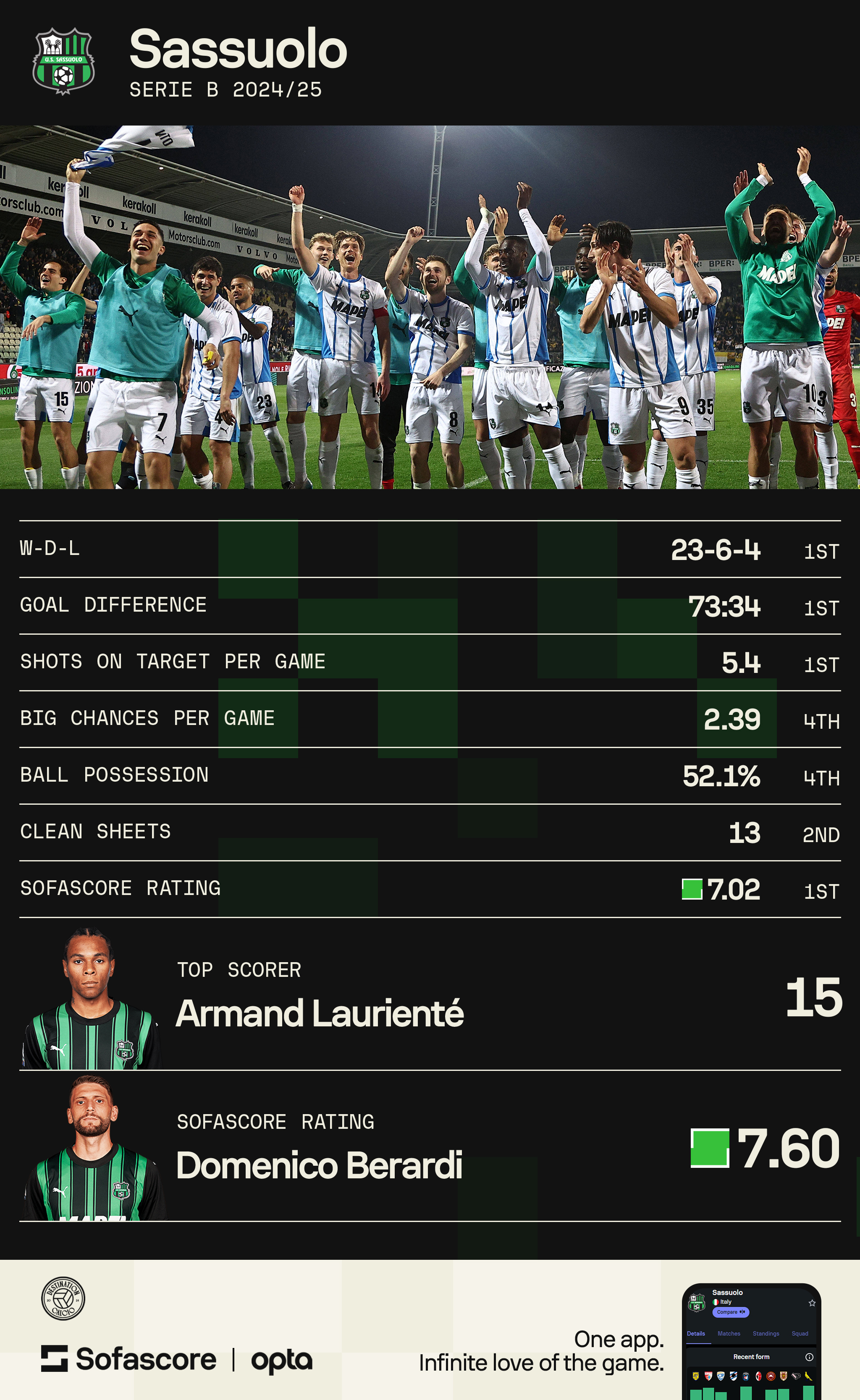 And then there is Domenico Berardi, whose 12 assists are the most of any player in Serie B this season. Convincing the Italy international to remain in Emilia in the summer was arguably as big a coup as appointing Grosso, who has now promotion at the first time of asking twice in a row.