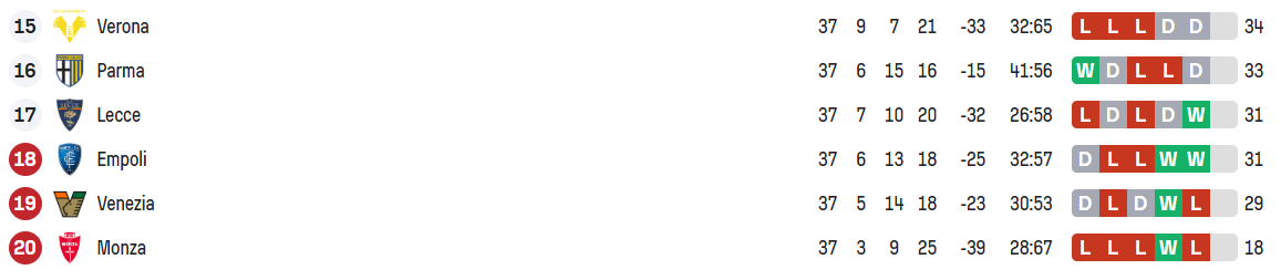 There is a scenario in which Verona, Parma, Lecce and Empoli all finish level on 34 points. If this happens, a classifica avulsa or mini-table will form, counting all their head-to-head results against each other. That would save Lecce (12 pts) and Empoli (11) from the drop and set up a two-legged relegation play-off between Verona (5) and Parma (3). If just Lecce, Empoli and Verona finish level on 34 points, Lecce would again be saved by the classifica avulsa and Verona would face Empoli in the play-off.