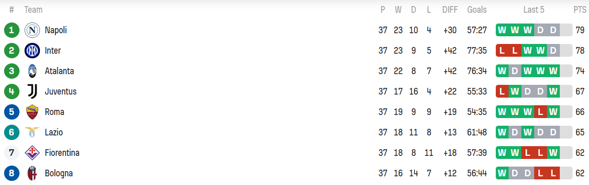 Importantly, Juve have the superior head-to-head record over Lazio, so they will finish above the Biancocelesti if they end up on equal points. Likewise, they will finish ahead of Roma if they end up level as although they drew both of their meetings this season, the Bianconeri hold the superior goal difference (+22 to +19), which is the next tiebreaker.