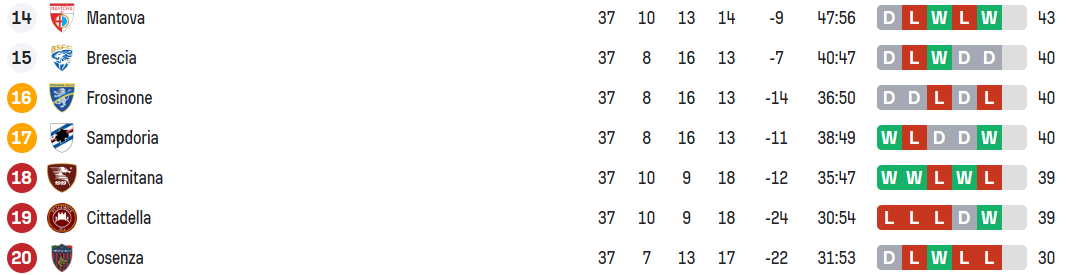 However, should Brescia draw or win against Reggiana, and Frosinone, Sampdoria, Cittadella and Salernitana all finish on 40 points, then the play-out would be Frosinone vs Salernitana.