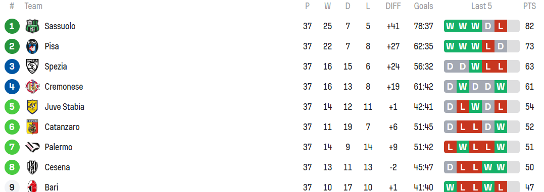 Sassuolo and Pisa have punched their ticket to Serie A, while Spezia and Cremonese have secured a bye to the play-off semi-finals. Juve Stabia, Catanzaro and Palermo are all in the play-offs, with Cesena fancied to hold on to the final spot ahead of Bari. Final placings are to be decided.