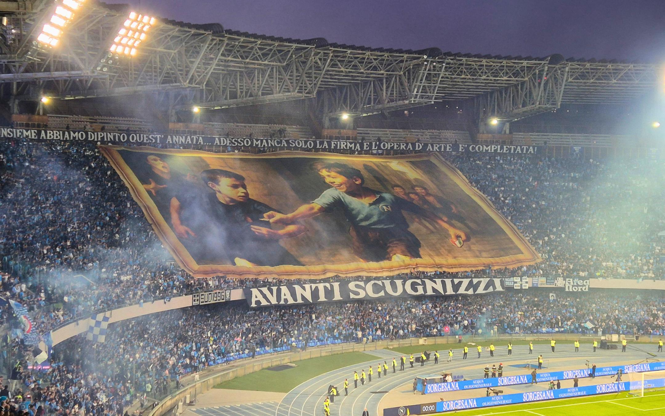 As such, the tifo depicting two kids, one wearing a Napoli top, running through the streets with the caption “Avanti Scugnizzi” (Let’s go Scugnizzi) felt particularly apt. Better still, the painting-like tifo was adorned with a message that ran the length of the Curva B that read, “Together, we’ve painted this season’s picture. All that’s left is the signature, and the masterpiece will be complete.”